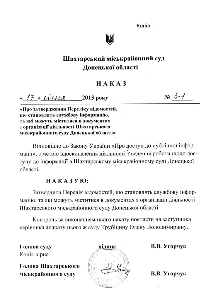 Про затвердження Переліку відомостей, що становлять службову інформацію, та які можуть міститися в документах з організації діяльності Шахтарського міськрайонного суду